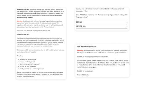 × These are all examples of what information looks like on product pages for waxes. Some are much more detailed than others and the layouts vary, making it hard for a user to know where find the details they are seeking.